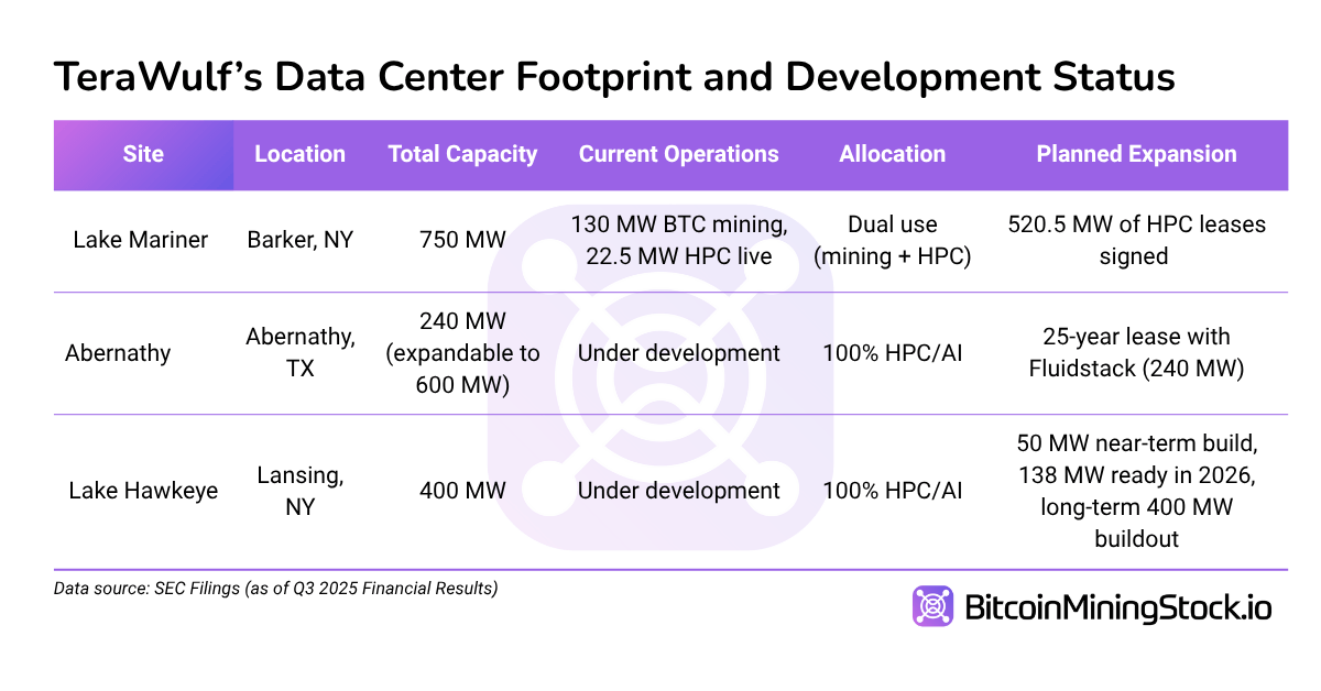 Совместное предприятие Abernathy хвастается своей уникальной структурой: это включает в себя 25-летнюю аренду, обеспеченную кредитным усилением от Google в размере 1,3 млрд долларов. Кроме того, TeraWulf имеет контрольный пакет акций в размере 51% и права на дополнительное расширение мощностей на 200 МВт, осуществляемое Fluidstack.